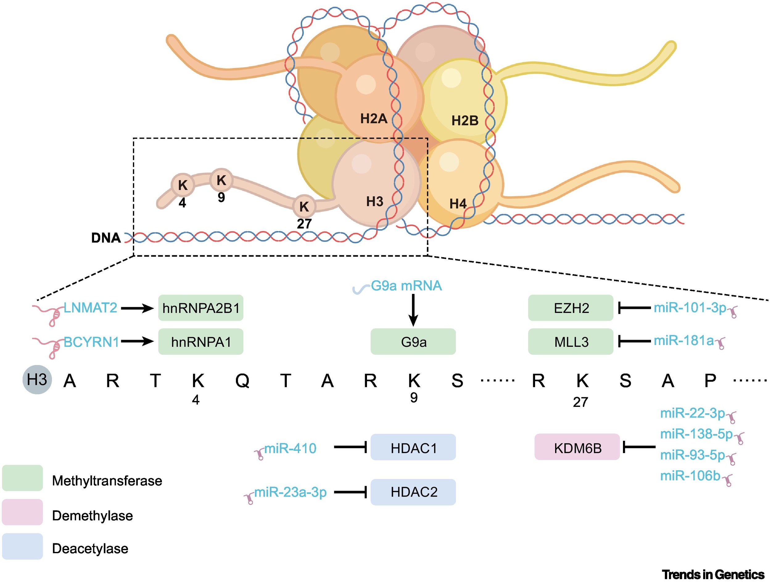 Histone modifications, including histone methylation and acetylation, mainly occur at the lysine residues of histone H3 or H4. These modifications are dynamically regulated by protein methyltransferases (HMT), lysine-specific demethylases (KMT), histone acetyltransferase (HAT), and histone deacetylases (HDAC). EV-delivered long noncoding RNAs (lncRNAs) such as UFC1, LNMAT2, and BCYRN1 can recruit HMT to increase histone methylation. In addition, EVs can regulate the expression of “writers” and “erasers” of histone modifications by delivering miRNA and mRNA, thereby reshaping the epigenetic landscape (Figure 2).