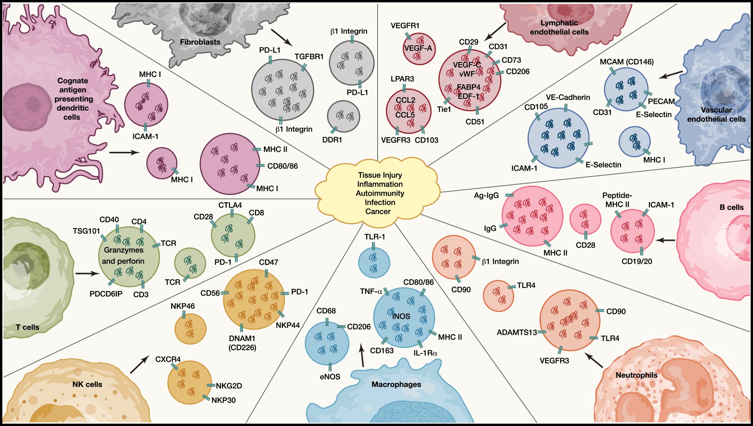 EVs are generated by all immune and tissue-resident cells, playing key roles in influencing multiple biological pathways associated with tissue injury, inflammation, autoimmunity, infection, and cancer. In different pathological contexts, EVs produced by fibroblasts, vascular endothelial cells, lymphatic endothelial cells, B cells, T cells, natural killer (NK) cells, dendritic cells (DCs), macrophages, and neutrophils may work in a coordinated manner to provide both positive and negative signals.