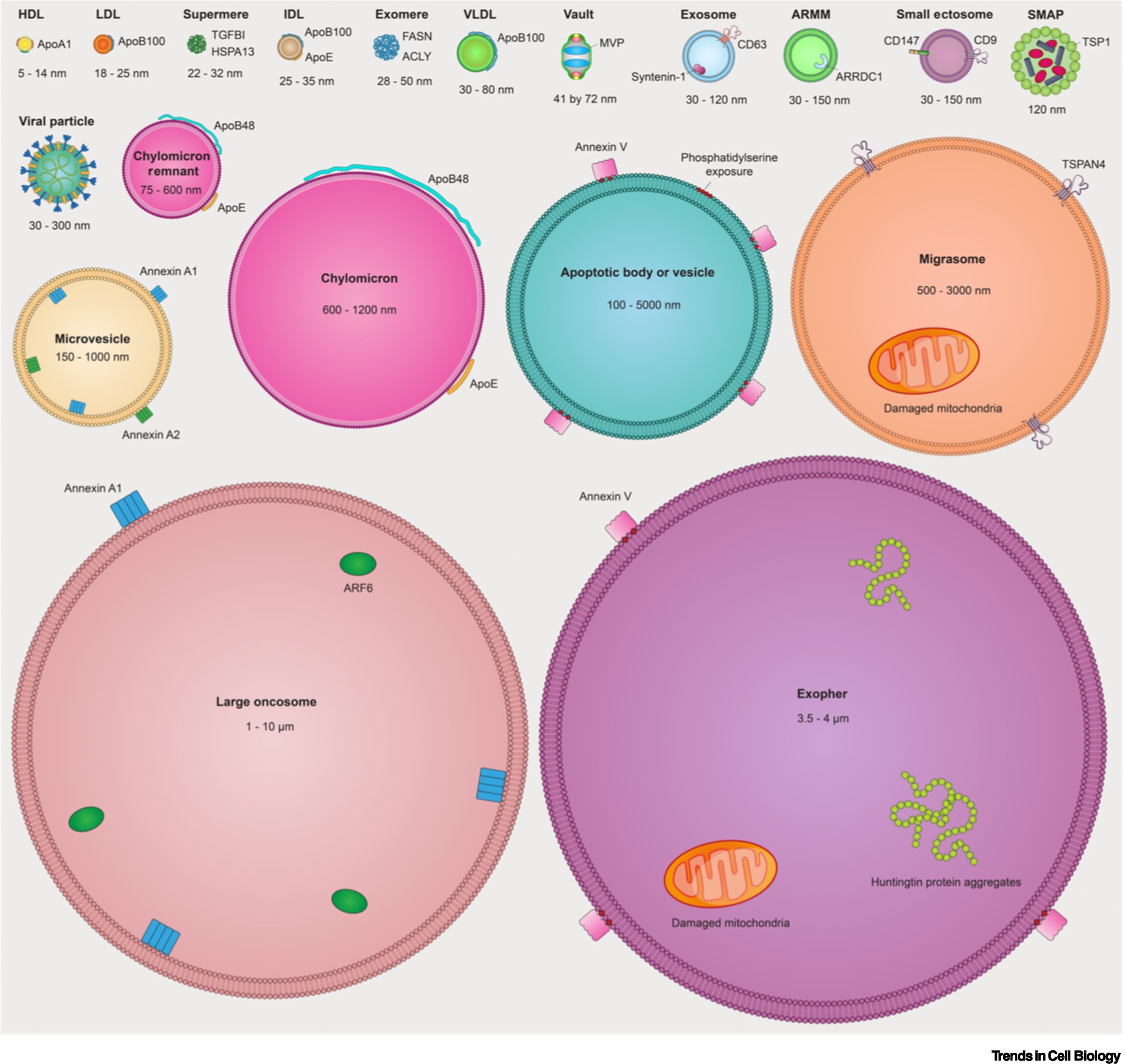 Classification of EVs is based on their origin and biogenesis, encompassing three major modes: apoptotic EVs (apoptotic bodies and vesicles) produced during apoptotic cell division, ectosomes produced by outward budding from the plasma membrane, and secretosomes produced by inward budding from endosomal compartments, later released by fusion with the plasma membrane. Given the plethora of EV types and uncertainty surrounding their biological origin, MISEV adopts a pragmatic approach, categorizing EVs as either “large EVs” (>200 nm) or “small EVs” (<200 nm). Thus, we review diverse EV types, NVEPs, and the latest advances concerning these extracellular particles.
