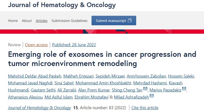Paskeh MDA, Entezari M, Mirzaei S, et al. Emerging role of exosomes in cancer progression and tumor microenvironment remodeling. J Hematol Oncol. 2022;15(1):83. Published 2022 Jun 28. doi:10.1186/s13045-022-01305-4