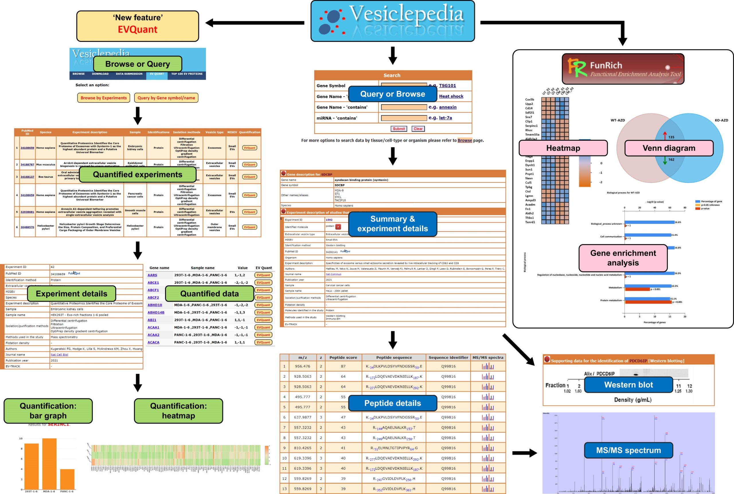 Vesiclepedia is a fusion of MySQL as the backend database, the Zope content management system, and Python as the programming language linking the database and content management system. The website empowers users to seamlessly query or browse the database and download the entire dataset as a free tab-delimited file. Whether querying a gene or exploring EV studies, users gain access to supplementary information such as gene summaries, EV isolation methods, flotation density (if available), EV subtype and sample source. Cargo data in Vesiclepedia result from community annotation or meticulous manual curation of docum. While databases like ExoCarta focus on exosomes or small EVs, such as ExoCarta, Vesiclepedia (http://www.microvesicles.org) spans cargos from various EV subtypes and EPs.