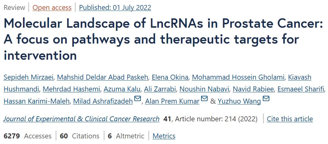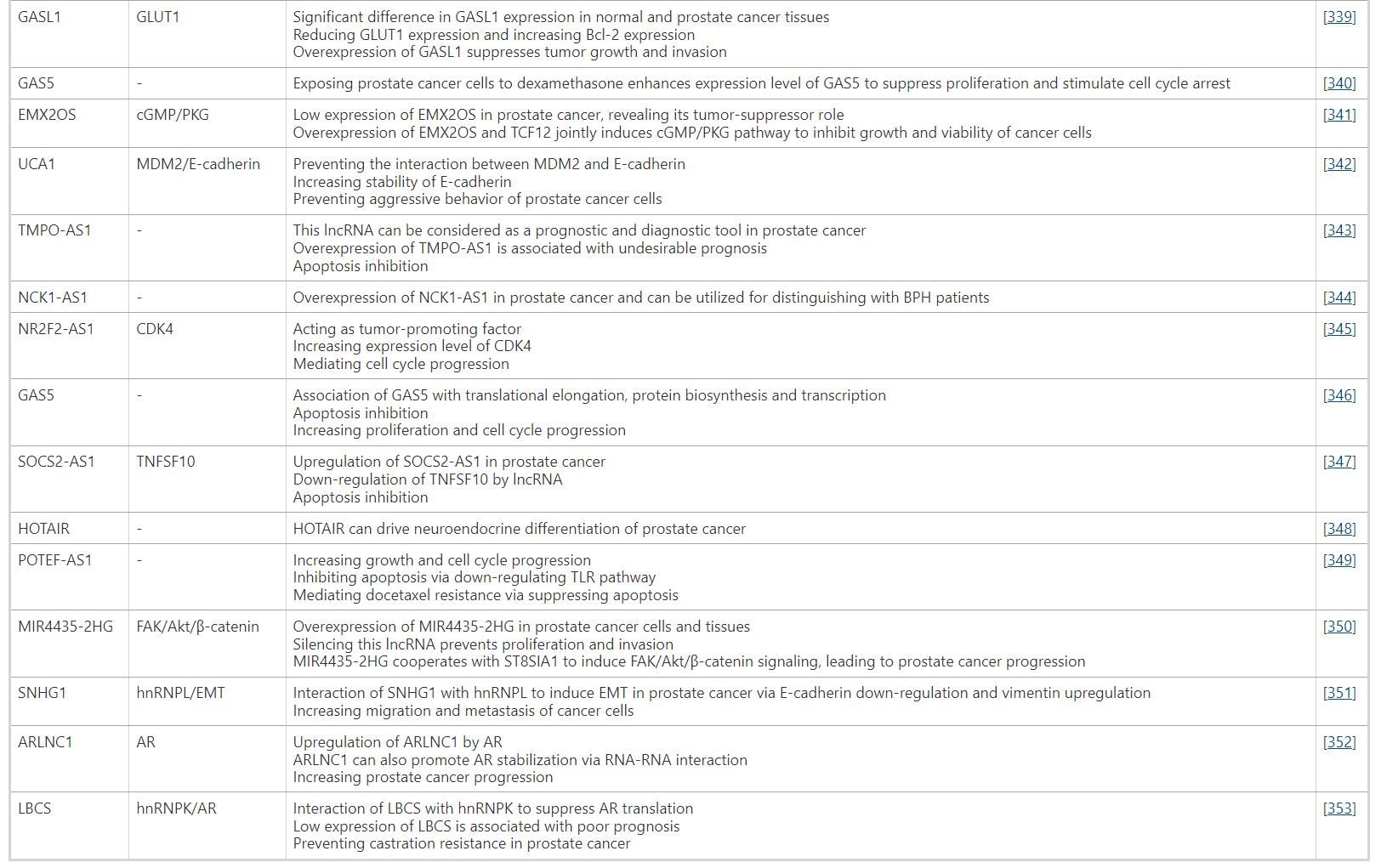 Mirzaei S, Paskeh MDA, Okina E, et al. Molecular Landscape of LncRNAs in Prostate Cancer: A focus on pathways and therapeutic targets for intervention. J Exp Clin Cancer Res. 2022;41(1):214. Published 2022 Jul 1. doi:10.1186/s13046-022-02406-1