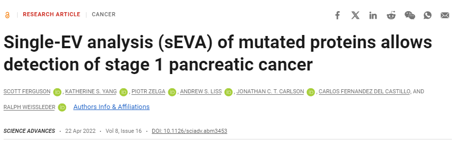 Ferguson S, Yang KS, Zelga P, et al. Single-EV analysis (sEVA) of mutated proteins allows detection of stage 1 pancreatic cancer. Sci Adv. 2022;8(16):eabm3453. doi:10.1126/sciadv.abm3453
