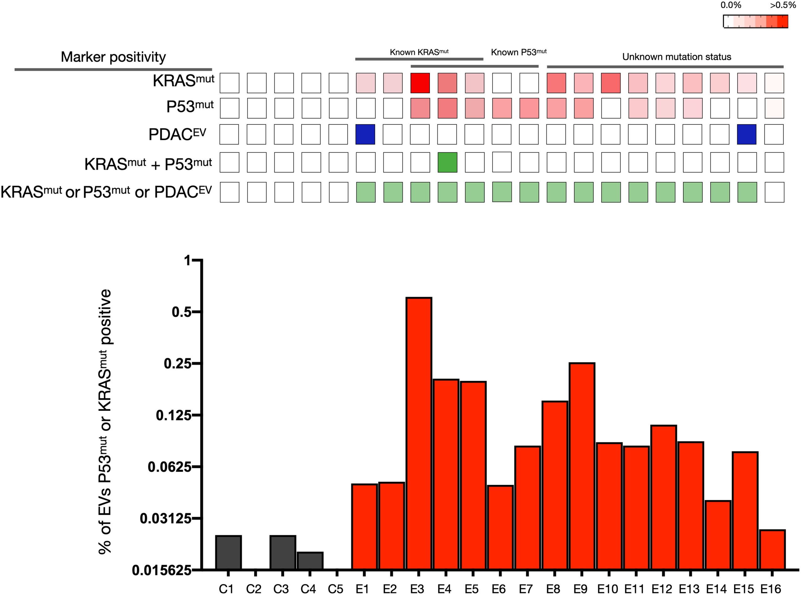 sEVA Analysis Results of Clinical Stage 1 PDAC Cases (A blinded study involving 16 patients with surgically confirmed stage 1 PDAC revealed that KRASmut and P53mut proteins were detectable at much lower levels, typically found in less than 0.1% of vesicles (i.e., positive in patient samples where the proportion of vesicles is usually less than 0.1%). These vesicles were detectable by the new sEVA method in 15 out of 16 patients.)