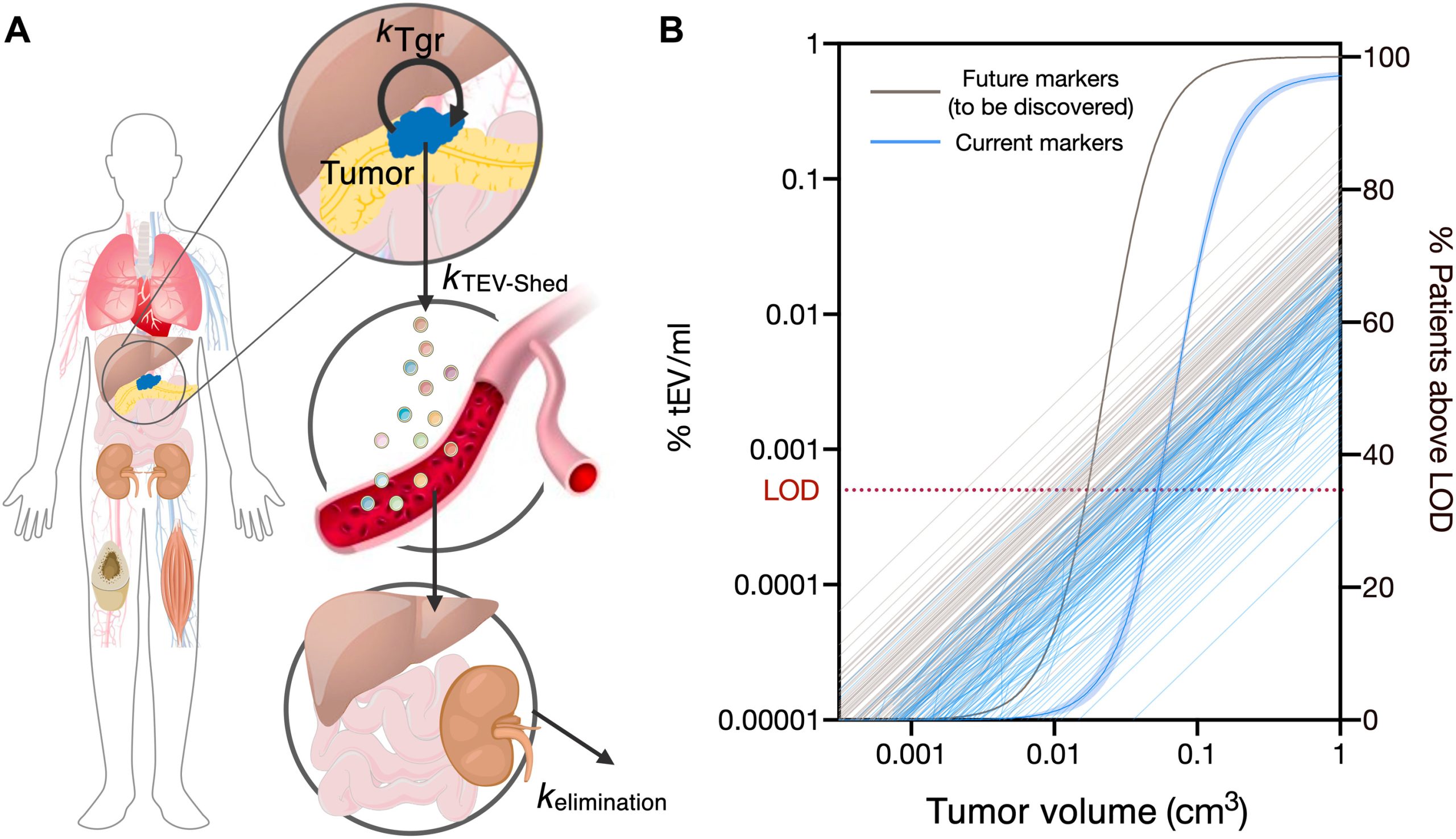 Modeling PDAC Cancer Detection Using Plasma sEVA (Utilizing a modeling approach, the authors estimated that the PDAC detection limit, based on single EV analysis (sEVA) technology, is approximately 0.1cm3 of tumor volume. This surpasses the capabilities of clinical imaging methods. These findings establish the potential of sEVA for early cancer detection.)