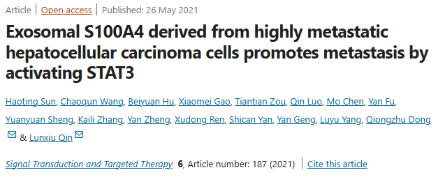 Sun, Haoting et al. “Exosomal S100A4 derived from highly metastatic hepatocellular carcinoma cells promotes metastasis by activating STAT3.” Signal Transduction and Targeted Therapy vol. 6,1 187. 26 May. 2021, doi:10.1038/s41392-021-00579-3