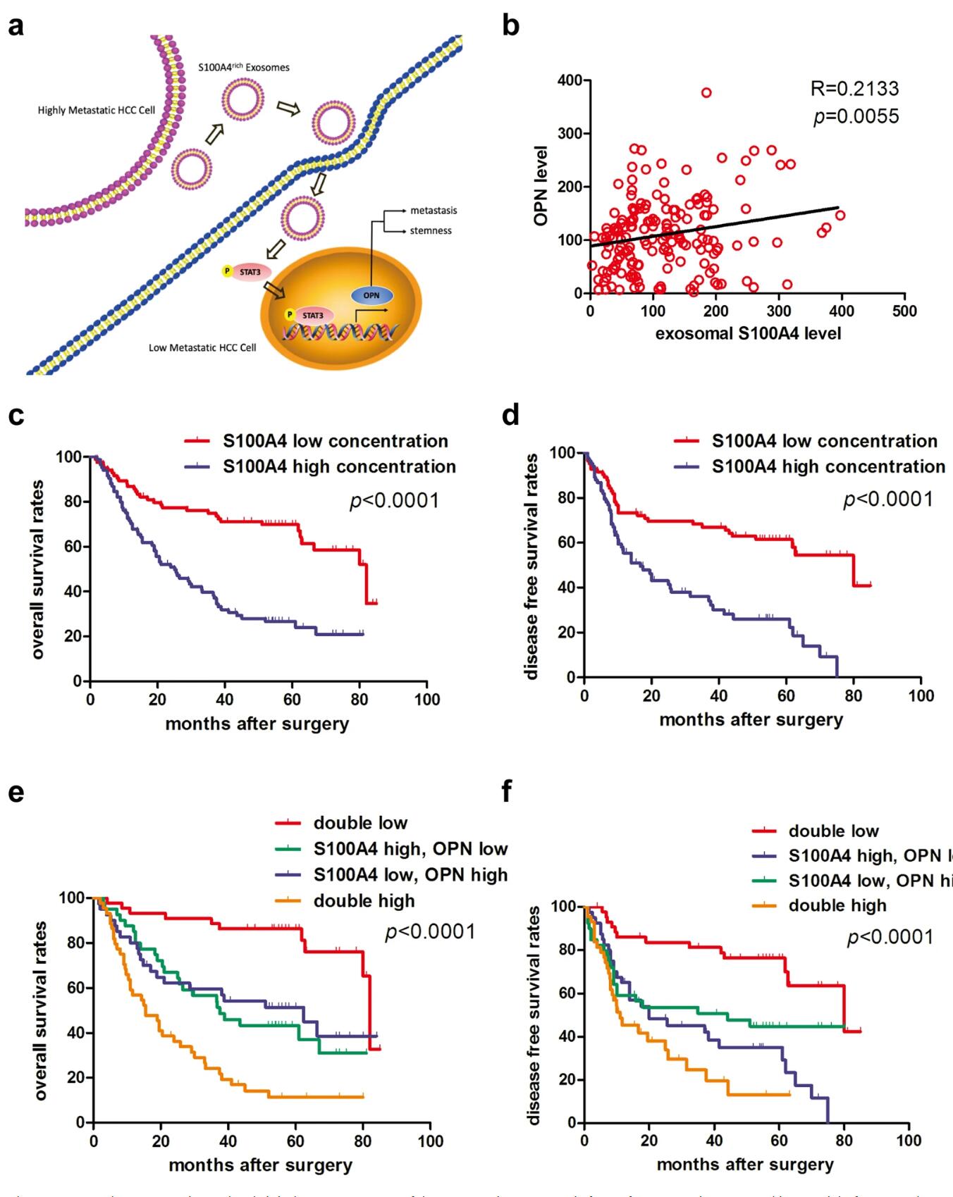 HCC patients with high plasma S100A4 levels also had worse prognoses. In summary, exosomes from HMH cells enhance the metastatic potential of LMH cells, with exosomal S100A4 acting as a key metastasis enhancer by activating STAT3 phosphorylation and upregulating OPN expression. This indicates that exosomal S100A4 is a novel prognostic marker and therapeutic target for HCC metastasis.