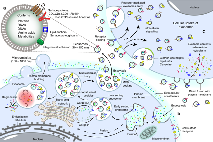 Trams et al. found that shed membrane vesicles may have physiological functions and suggested that these vesicles are exosomes. In 1983, Harding et al. observed that membrane-bound vesicles can be released by multivesicular endosome (MVE) exocytosis. Subsequently, the researchers discovered that transferrin receptors can be translocated from the cell surface into internal vesicles to form MVEs. In 1987, Johnstone et al. observed that the release of exosomes during reticulocyte maturation was associated with plasma membrane activity. Raposo et al. later found that exosomes played an important role in antigen presentation and T cell activation. Then, the relationship between exosomes and tumors was reported. In 2007, Valadi et al. found that exosomes can deliver mRNA and microRNA to other cells, suggesting that exosomes can mediate cell-to-cell communication by delivering nucleic acids. Since then, more and more studies have shown that exosomes play important physiological and pathological roles by mediating cell-to-cell communication. Exosomes contain different types of proteins, nucleic acids, amino acids, and metabolites, among which CD9, CD63, CD81, flotillin, and annexins can be used as markers. The identification of exosomes is mainly based on morphological characteristics, particle size, and characteristic proteins such as CD9, CD63, CD81, and HSP90.
