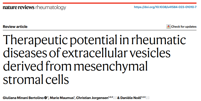 Bertolino GM, Maumus M, Jorgensen C, Noël D. Therapeutic potential in rheumatic diseases of extracellular vesicles derived from mesenchymal stromal cells. Nat Rev Rheumatol. 2023 Sep 4. doi: 10.1038/s41584-023-01010-7. Epub ahead of print. PMID: 37666995.