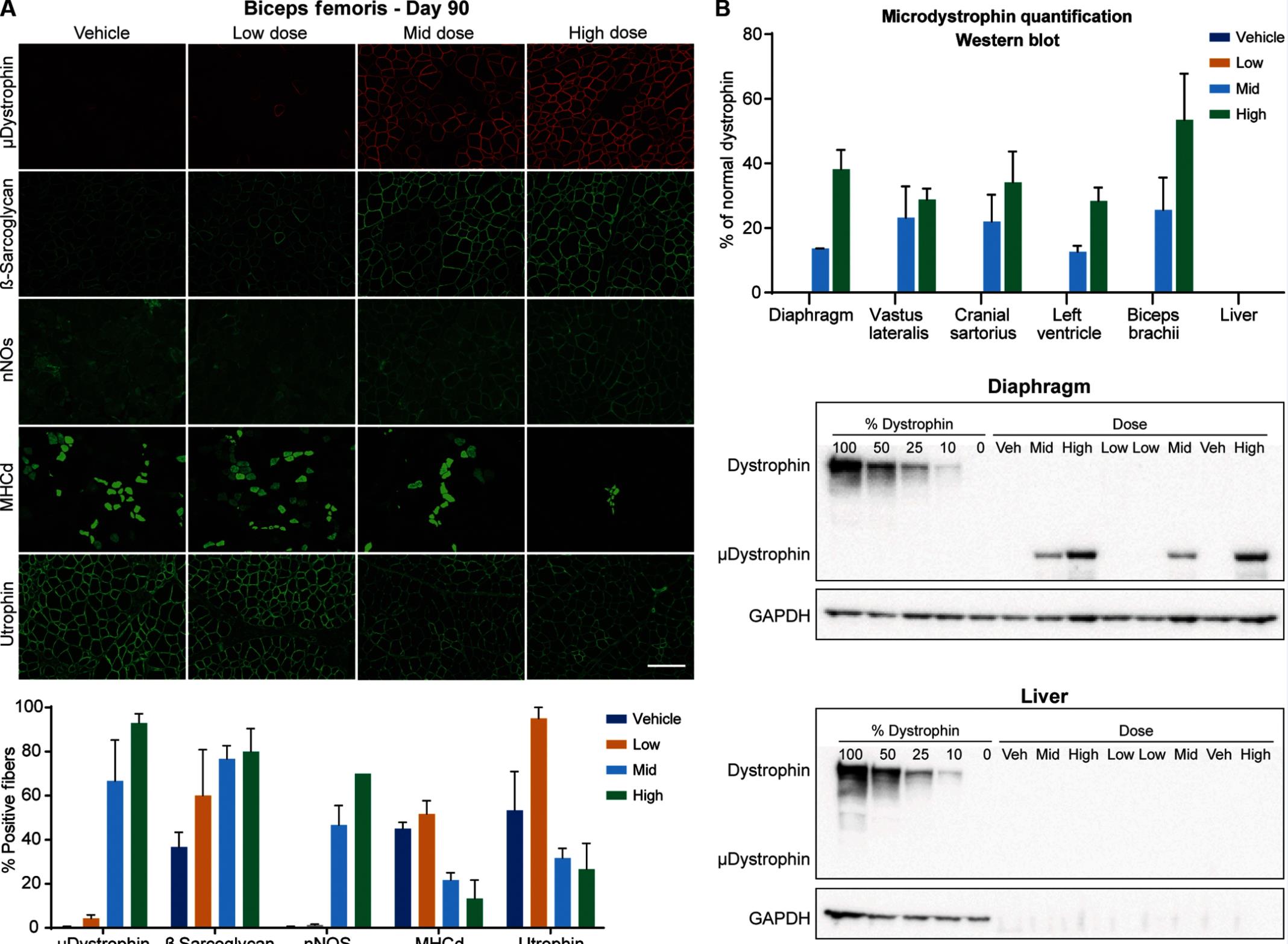 The results showed a dose-based increase in genomic copy number in the tissues of treated dogs, expression of the μDys5 protein in muscle tissue and heart, improved limb and respiratory muscle function, and reduced histopathological lesions in the dogs. As expected, the phenotype and histopathological lesions did not fully return to normal due to the expression of the microdystrophin protein. In addition, the different dose treatment groups were well tolerated with no adverse events.