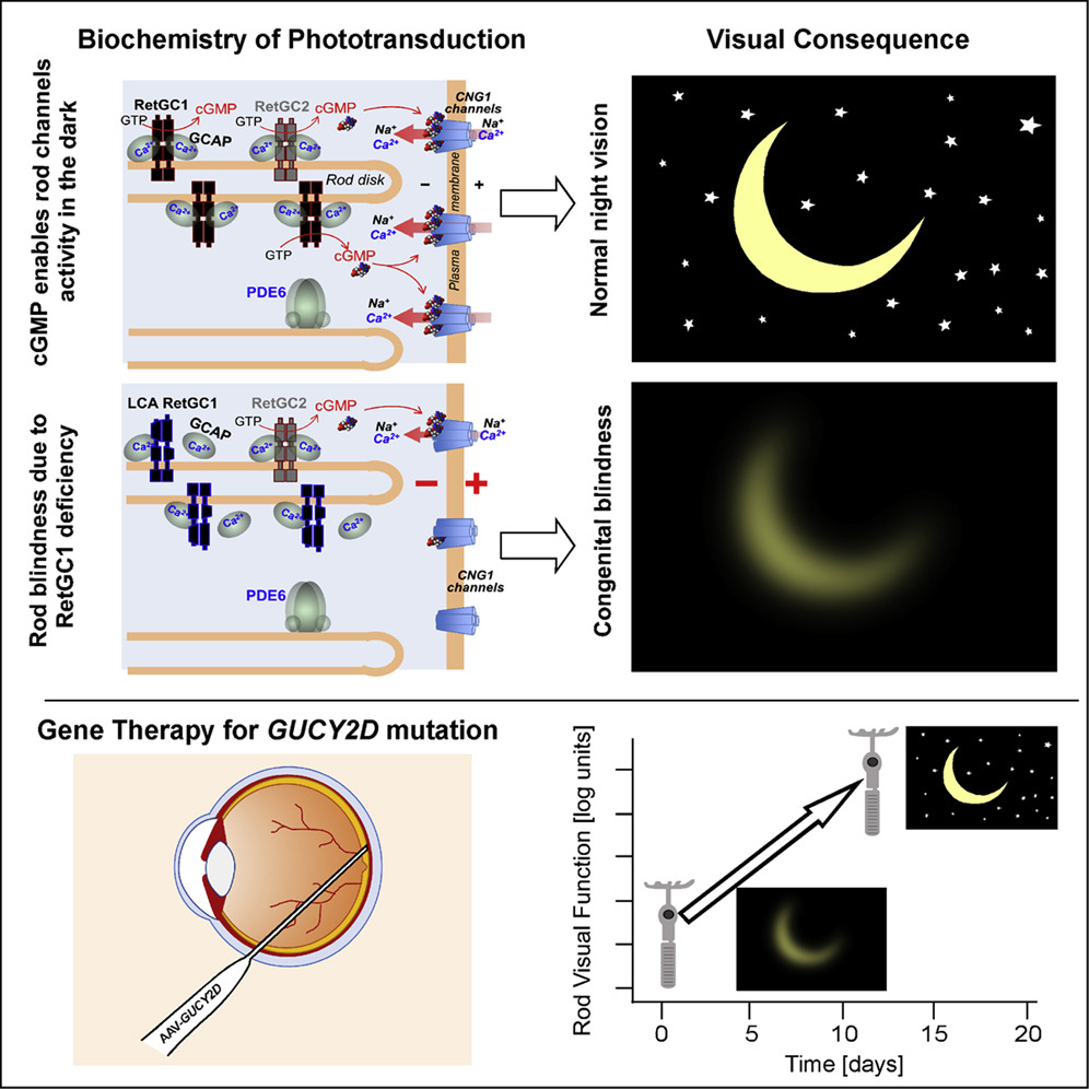 Up to 20 percent of patients with LCA are affected by mutations in the GUCY2D gene, which encodes a key protein required for the “phototransduction cascade” in retinal photoreceptor cells, a process that converts light signals into neuronal signals. Previous studies have shown that patients with LCA due to GUCY2D mutations often have some surviving photoreceptor cells, particularly in areas where optic rods (responsible for night vision) are abundant, suggesting that optic rod phototransduction can work again in the presence of GUCY2D.