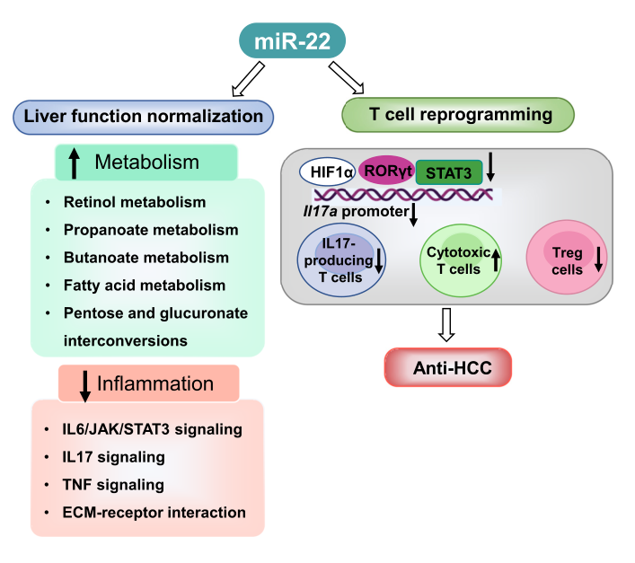 Furthermore, miR-22 therapy improved metabolism and reduced inflammation. In the liver, miR-22 reduced the abundance of IL-17-producing T cells by decreasing the occupancy of HIF1a at the RORC and IL17A genes and inhibited IL-17 signaling. Conversely, enhancing IL-17 signaling improved the anti-liver cancer effects of miR-22. Additionally, miR-22 expanded cytotoxic T cells and reduced regulatory T cells (Treg).