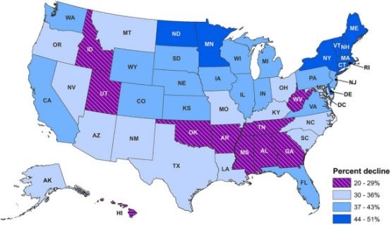 In addition, the study found differences in cancer mortality among people of different racial/ethnic, economic and educational levels or residential areas. For example, breast cancer mortality declined by a total of 39% between 1988-1990 and 2013-2015, but 10 states in the United States only had a decline of 20%-29%. Geographic difference results from changes in risk factors and access to screening and quality treatment, all of which are influenced by socio-economic factors, legislative policies, education levels, and quality of care.