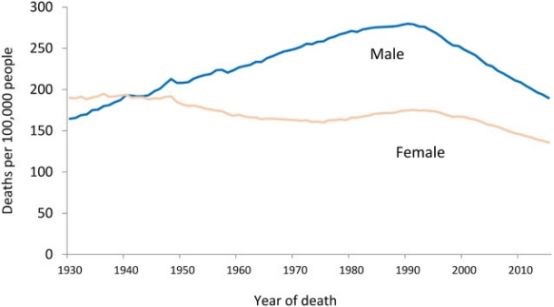 Trends in standardized cancer mortality rates for male and female ages in the United States from 1930 to 2015