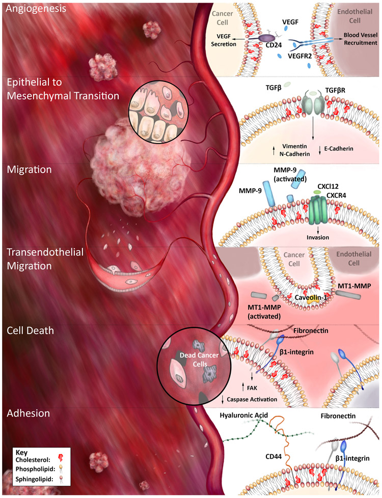 In general, lipid rafts and lipid raft components play a complex role in cancer metastatic cascade signal transduction, which is essential for the development of new therapies to curb cancer metastasis.