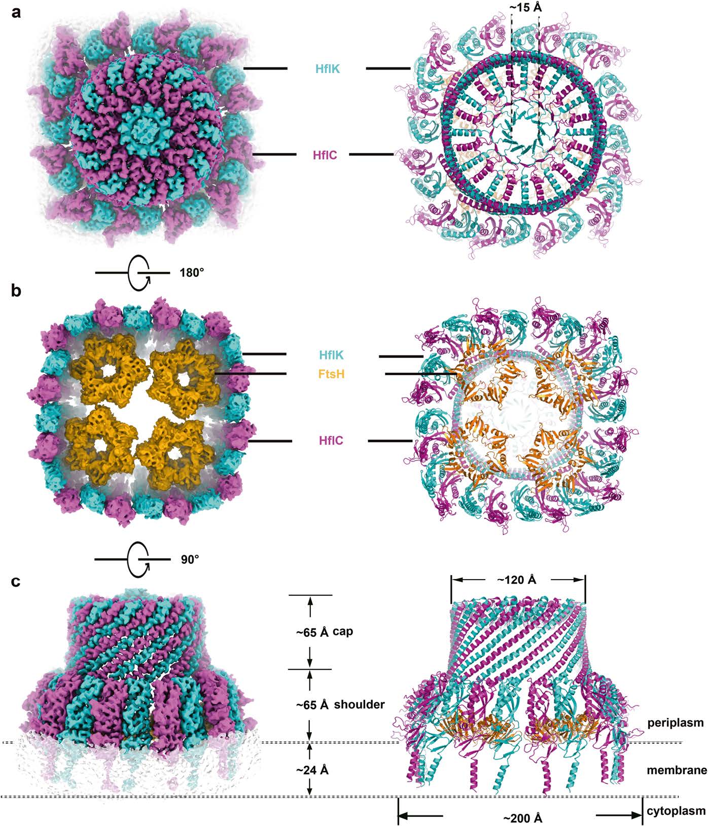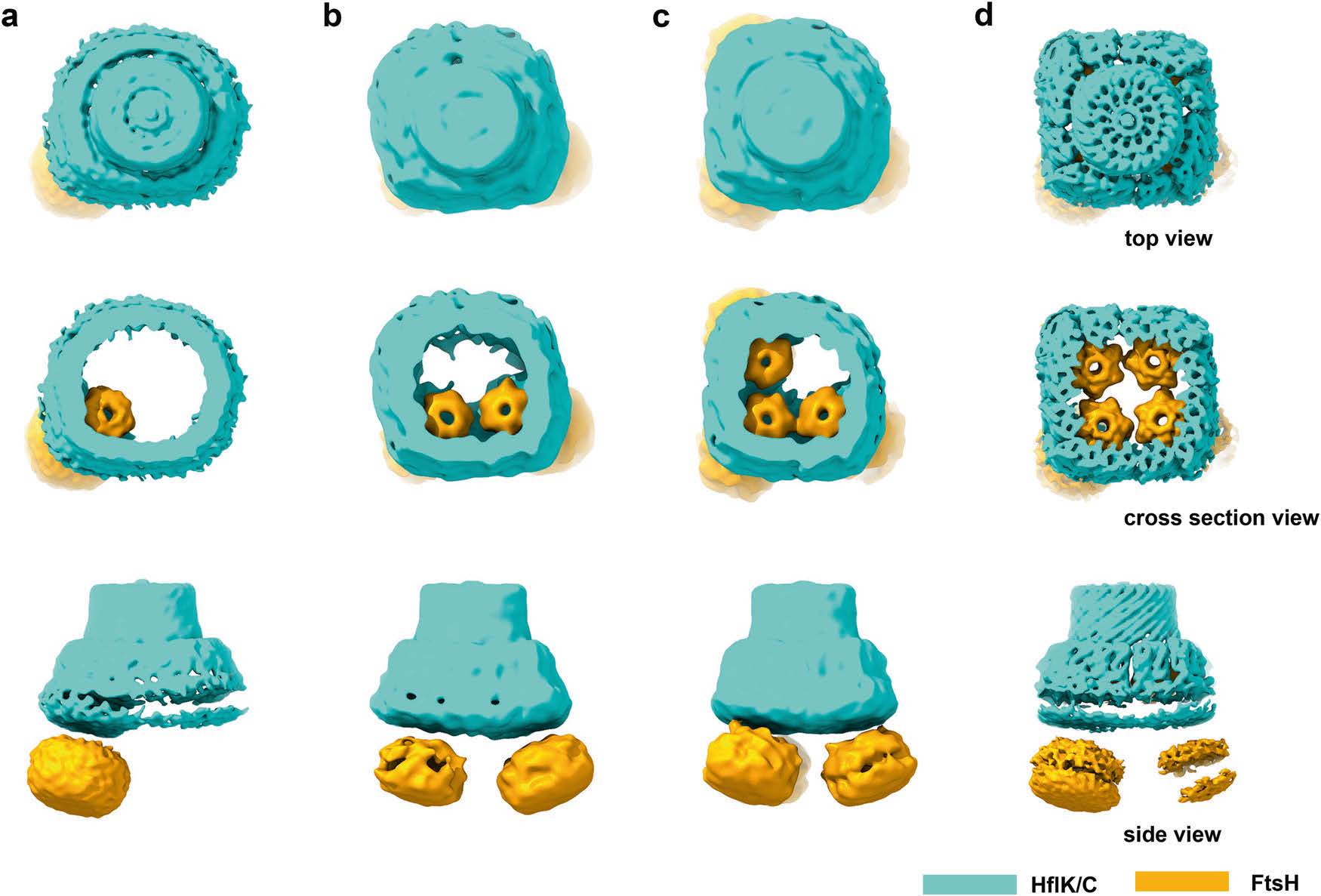 First of all, the Cryo-EM data analysis showed that HflK/C took heterodimer as the basic unit, and 12 HflK molecules and 12 HflC molecules were arranged at intervals on the intima to form a cage-like structure of transmembrane hetero-24 polymer. The transmembrane region (N-terminal region) of HflK/C formed and isolated a membrane microdomain (20 nm in diameter); most of the amino acid residues of HflK/C were located in the periplasmic space and assembled into a completely sealed cage structure. More interestingly, FtsH hexamers can be suspended in the micro membrane domain formed by HflK/C, and a cage structure can contain up to 4 FtsH hexamers. The periplasmic domain (PD) of FtsH hexamer was completely wrapped in the cage structure formed by HflK/C in the periplasmic space and directly interacted with the SPFH domain of HflK molecules in the complex.