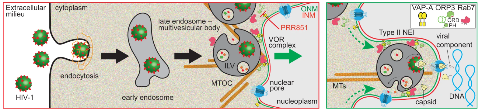Endocytosed EVs enter the nucleoplasmic reticulum (NR), especially type II nuclear envelope invaginations (NEIs); then pass through nuclear pore complexes (NPCs) on the nuclear membrane to deliver EVs to the interior of the nucleus. The premise of this process is that late endosomes dock on the nuclear outer membrane. This docking process is mediated by the VOR protein complex. The docking is mediated by the VOR protein complex, comprised of ONM-localized vesicle-associated membrane protein (VAMP)-associated protein A (VAP-A), cytoplasmic oxysterol-binding protein (OSBP)-related protein-3 (ORP3), and late endosome-associated small GTPase Rab7.
