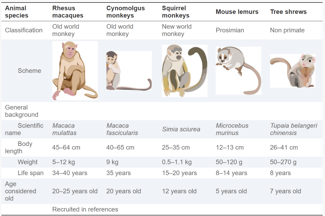 Therefore, to understand complex age-related human diseases, the use of nonhuman primate (NHP) brains is highly desirable because of its closer phylogenetic relationship with humans, similar neuroanatomical structures, and Similar genetic characteristics, similar complex neural circuits and higher-order cognitive functions (Table 1).