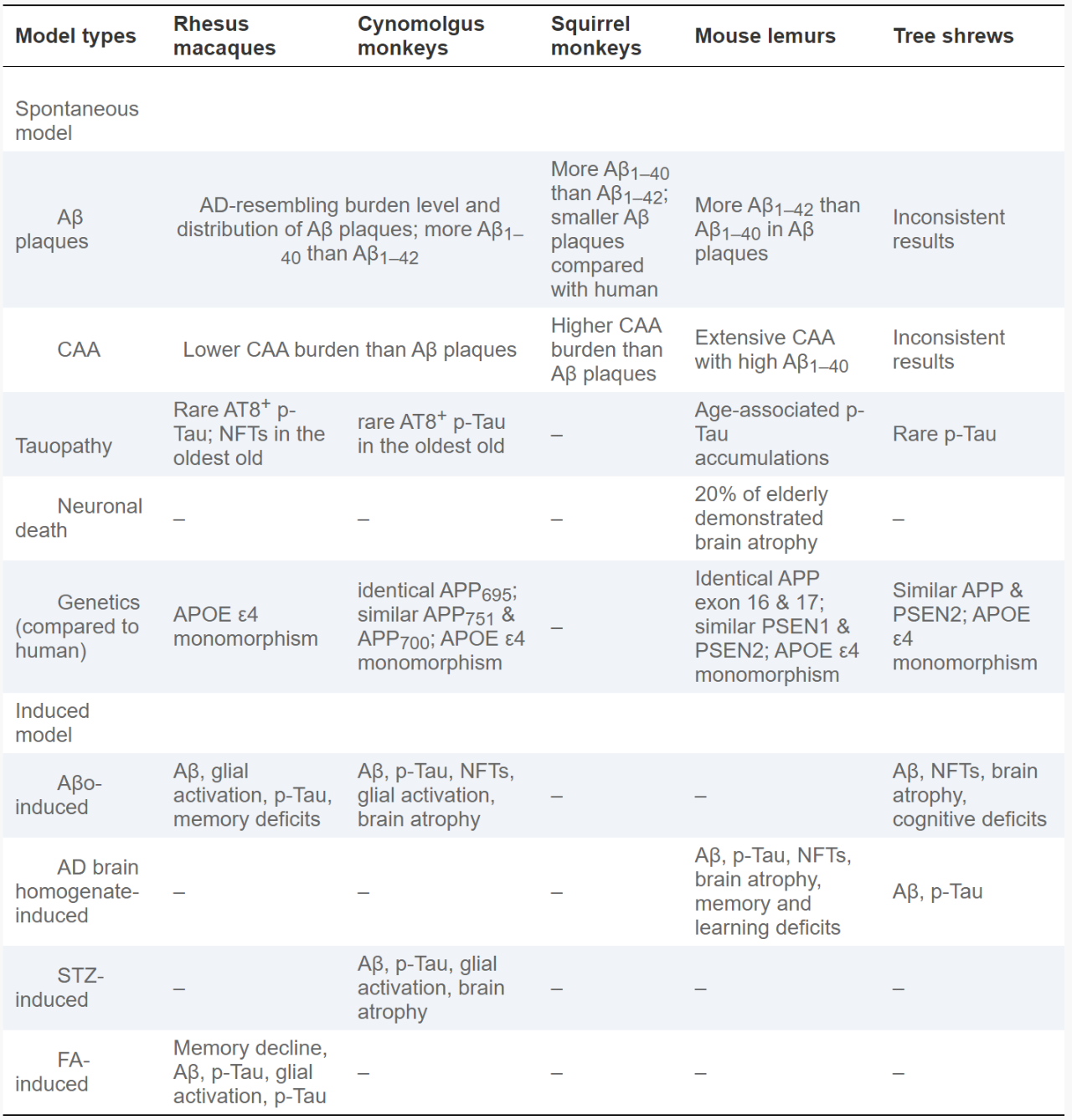 Table 2 Spontaneous (natural aging) and induced NHP AD models.