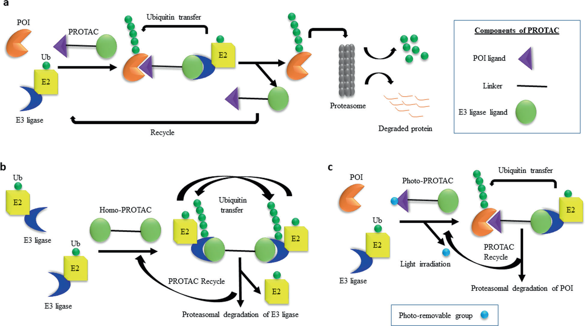 Figure c illustrates the mechanism of photocontrolled Photo-Protein Degraders-mediated degradation of proteins of interest. In photo-Protein Degrader, a photoremovable group is attached to an interest ligand or E3 ligase ligand or a “connector” (linker). After external light irradiation, the photomovable group was separated from photo-Protein Degrader and converted into active Protein Degrader, for protein of interest degradation.