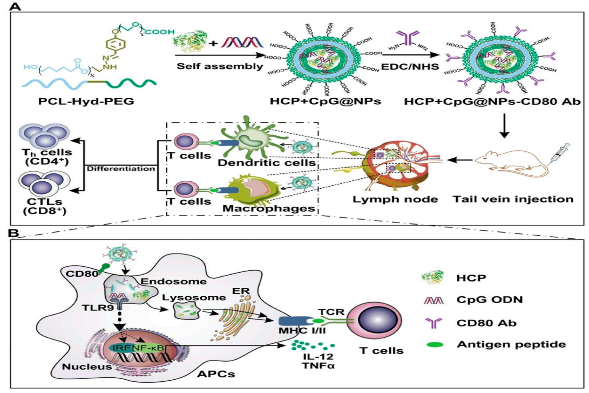 One of the primary functions of nanoparticles in cancer vaccines is to protect antigens from degradation in the body. Antigens, whether they are peptides, proteins, or nucleic acids, are often vulnerable to enzymatic degradation when administered alone. Nanoparticles act as protective carriers, encapsulating antigens and delivering them to APCs, such as dendritic cells (DCs), in a stable form. Once taken up by DCs, the antigens are processed and presented on the cell surface in the context of major histocompatibility complex (MHC) molecules, initiating an immune response.