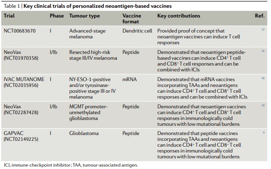 The following table summarizes several key clinical trials of individualized new antigen vaccines, including dendritic cells, peptides, and mRNA. The first trial to evaluate immunogenicity and immunological characteristics of individualized novel antigen vaccines (NCT00683670) used a strategy based on autologous dendritic cells. The results showed that the novel antigen vaccine can induce response of CD8+T cell and a variety of TCR, revealed that the therapeutic novel antigen vaccine could increase the diversity and breadth of T cell response for the first time.