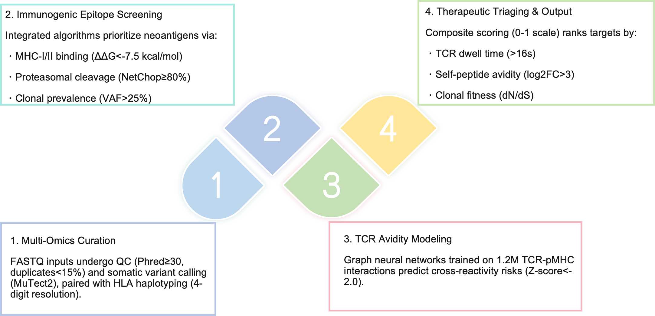 The platform demonstrates reduced predictive power for γδ TCR-neoantigen interactions (AUC=0.67), potentially reflecting insufficient training data for non-classical MHC recognition. Furthermore, while our model accounts for 94% of common HLA alleles (HLA-A02:01–HLA-B57:01), rare variants (frequency <0.1%) may necessitate supplemental molecular dynamics simulations. This computational framework may potentiate first-in-class bispecific T-cell engagers, with three candidate molecules currently in lead optimization. For translational researchers navigating the neoantigen discovery landscape, our platform offers not merely acceleration but a paradigm shift toward rationally engineered TCR therapeutics.