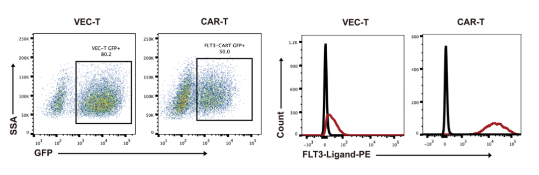 Fig.1 Flow cytometry analysis of GFP and FLT3L expression on FLT3L CAR-T cells. The figure shows that FLT3L-specific CAR-T cells effectively express the FLT-3 ligand.1