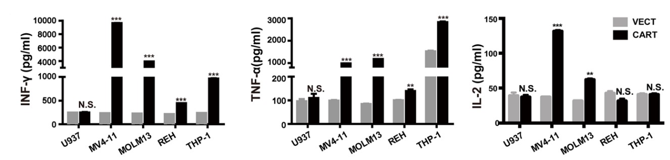 Fig.2 The expression of cytokines in CD19 CAR-T cells co-cultured with leukemia cells. The cytokines IFN-γ, TNF-α, and IL-2 in the supernatants are significantly increased and show high-level IFN-γ release.1