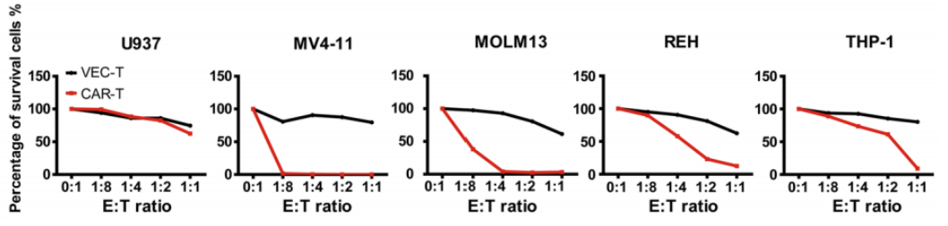 Fig.3 Cytotoxicity of FLT3L CAR-T against FLT3+ or FLT3- AML cell lines. FLT3L CAR-T cells exhibited antigen-specific cytotoxicity against FLT3+ leukemia cells.1