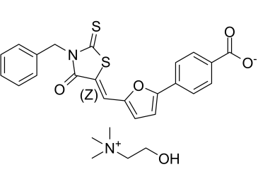 | SMILES | O=C([O-])C1=CC=C(C2=CC=C(/C=C(SC(N3CC4=CC=CC=C4)=S)/C3=O)O2)C=C1.OCC[N+](C)(C)C.[(Z)] |