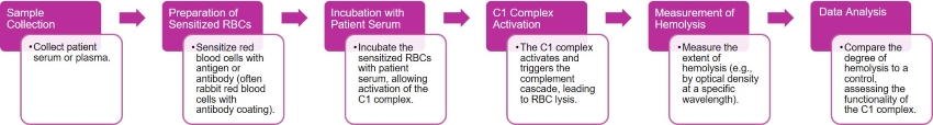 The C1 complex functional test evaluates the activity of the C1 complex within the classical complement pathway. The test involves mixing patient serum with a specific substrate or antigen-antibody complex that activates C1. C1 activation is then measured by the resulting breakdown of complement components, often monitored through hemolysis or other specific assays.