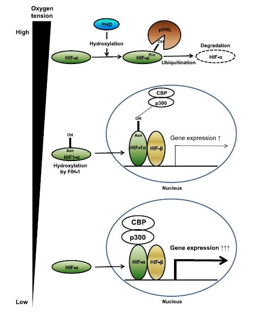 HIF is a major mediator in tissue and cellular adaptation to hypoxia. It upregulates the transcription of more than 100 target genes controlling hematopoiesis, angiogenesis, and anaerobic metabolism. HIF is a heterodimeric transcription factor consisting of alpha (HIF-α) and beta (HIF-β) subunits. Under normoxic circumstances, HIF-1α takes unique post-translational modification by factor inhibiting HIF-1 (FIH-1), that is an asparaginyl hydroxylase modifying one specific asparagine residue of HIF-1α. This modification inhibits the binding of coactivators CBP (CREB-binding protein) and p300, leading to repressed transactivation. FIH-1 is largely expressed in distal tubules and podocytes, and it reveals a lower Km value for oxygen than PHD. Thereby, HIF-1α is stabilized by escaping degradation through the PHD/pVHL pathway and still experiences FIH-1-mediated oxygen-dependent transactivational regulation in a certain range of oxygen tension.