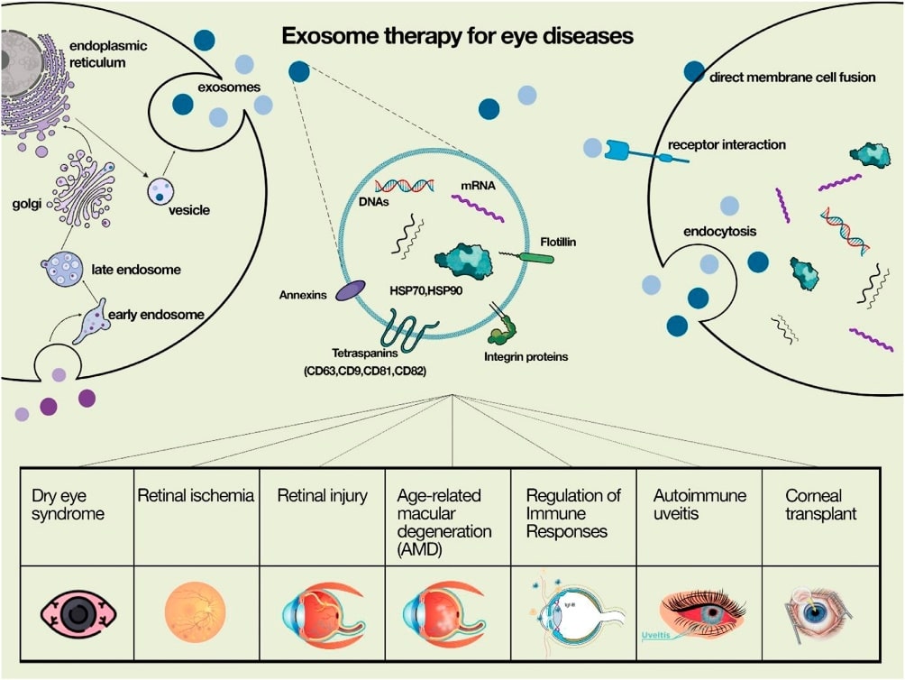 Dry eye syndrome is an eye disease caused by tear secretion disorder with dry eyes as the main symptom. Severe dry eye can lead to corneal damage and even vision impairment. At present, some studies have found that therapeutic exosomes for eye dryness, in the form of eye drops, can improve the immune microenvironment of the cornea and reshape the microenvironment of the ocular surface. Such therapeutic exosomes are expected to be used in the daily treatment of dry eye in the future. The retina is a soft and transparent membrane located on the inner wall of the eyeball, which is responsible for sensing light stimulation and imaging. Retinal damage or disease can lead to dark shadows in front of the eyes, decreased vision, and even blindness. Unfortunately, the retina cannot be regenerated. However, therapeutic exosomes for retinal repair have been reported to inhibit apoptosis of retinal cells, reduce the oxidation level of retinal pigment epithelium cells (RPECs) and enhance the proliferation of RPECs by intravitreal injection or retrobulbar injection. This opens up new avenues for cell-free therapy of retinal diseases.