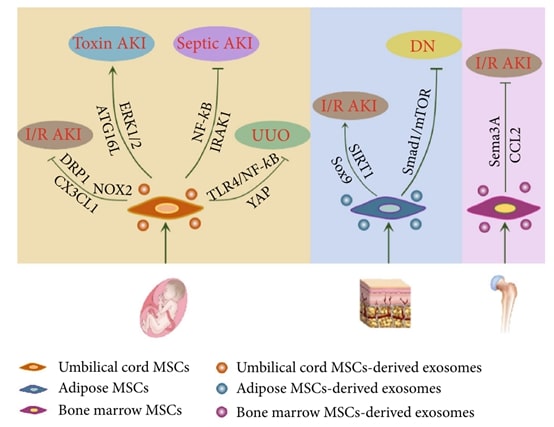 The multiple sources of therapeutic exosomes are under continuous investigation. Exosomes secreted by mesenchymal stem cells (MSCs) are plausible for the repair of damaged tubules, and their complex therapeutic mechanisms are being explored in mice. For example, enriched high concentrations of CCR2 bind to free CCL2 and inhibit the infiltration of immune cells and the production of pro-inflammatory factors. Its inhibition of fibrous-like formation in renal tubular epithelial cells was associated with miR-let7c. In addition, the delivered miR-199a-3p plays an important role in the rescue of apoptosis and injury. Exosomes from renal tubular epithelial cells improved the renal epithelial and vascular network, inhibited pro-inflammatory, pro-fibrotic and oxidative stress pathways, and restored the dynamic balance of the renal microenvironment. Proteomic analysis identified a significant improvement of 377 renal proteins by exosomal intervention. Urine-derived stem cell-derived exosomes promoted renal survival and vascular regeneration in early diabetes, which was associated with their delivery of EGF and angiopoietin to the kidney. Also, miR-21, one of the exosome cargoes, was found to enhance insulin secretion from pancreatic β-cells as well as renal tissue regeneration pathways. In conclusion, the consensus of multiple studies is that the therapeutic effects of exosomal agents are broad, correcting critical lesions and preventing the loss of renal function.
