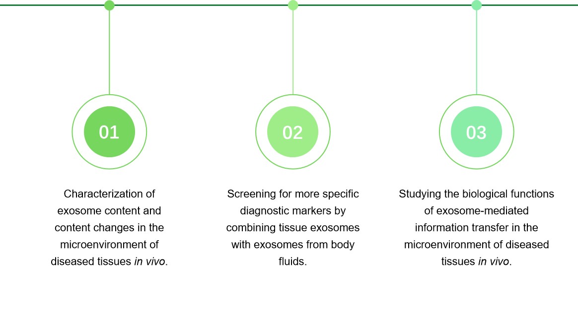 Tissue exosomes are exosomes found in the space between tissue cells, and they frequently function in the microenvironment of tissues that are ill. They are valuable for research because of their complex microenvironment that is closer to the real situation than cell lines, a richer source of information, and purer exclusivity than the humoral circulation. Currently, tissue exosomes are mainly used in the following three areas: