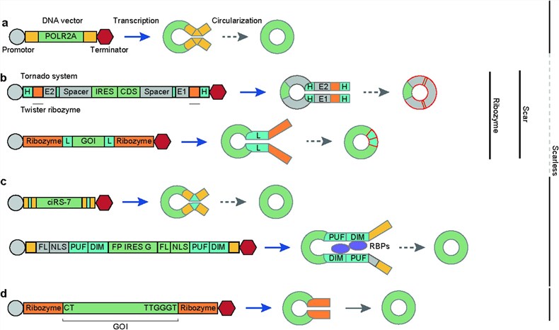 - Intron-based systems: Such as the permuted intron-exon (PIE) system, which employs group I self-splicing introns for circularization. Applicable both in vivo and in vitro, but may retain exogenous sequences.