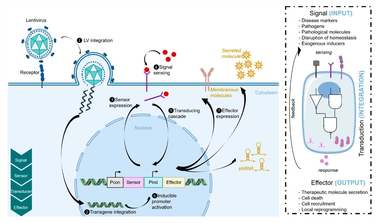 The development of effective clinical protocols relies on safe and efficient gene delivery. Lentiviruses, a subgroup of the retrovirus family, have become pivotal tools for modern gene therapy due to their unique ability to transduce both proliferating and quiescent cells, ensuring broad and persistent therapeutic action. Building on this inherent advantage, we engineer these vectors to be the definitive vehicle for delivering sophisticated synthetic gene networks. These networks carry the genetic blueprints for a complete 'sense-and-respond' system, featuring highly specific receptors to detect pathological markers, an internal transducing cascade to process the signal, and powerful effector molecules to enact the final therapeutic response—be it shRNA, cytokines, or pro-apoptotic cues.