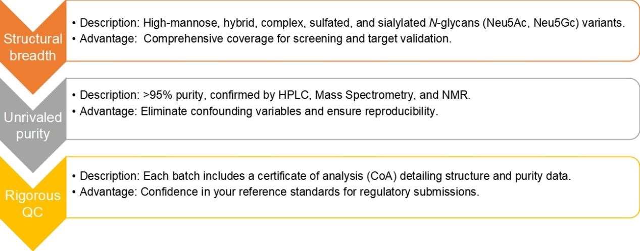 Glycosylation is a critical quality attribute for therapeutic proteins as it directly impacts efficacy, immunogenicity, and pharmacokinetics. Our highly pure, structurally defined N-glycan standards are essential for the stringent regulatory landscape of biopharma.