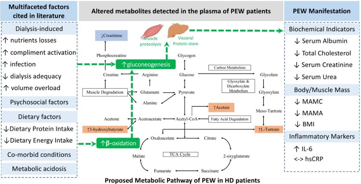 This study investigated the metabolic profile of protein energy wasting (PEW) in hemodialysis patients. Using metabolomics techniques, the authors pinpointed biomarkers associated with PEW and elucidated metabolic abnormalities associated with the disease. The study found significant differences in the concentrations of specific metabolites between patients with and without PEW. The results suggest that metabolomics is an effective approach for discovering PEW-related biomarkers and understanding underlying metabolic disorders. The authors suggest that future studies should adopt targeted strategies to identify potential therapeutic approaches that may modulate metabolites associated with gluconeogenesis.