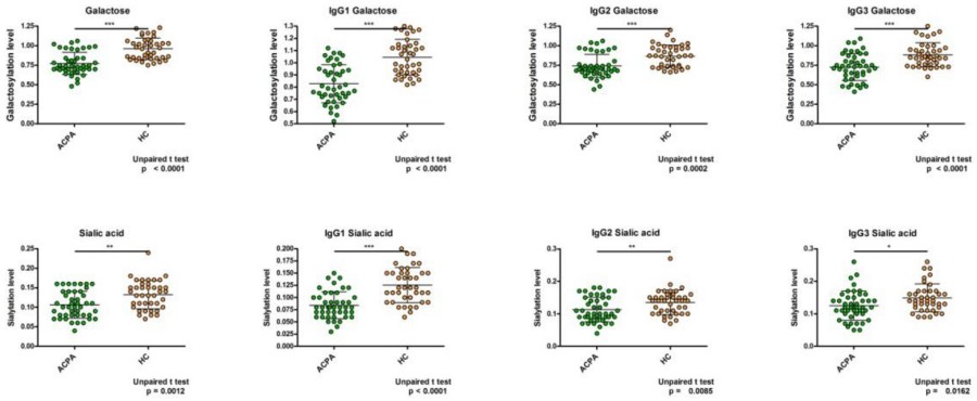 Fig.2 Comparison of galactosylation and sialylation levels in ACPA-IgG and healthy IgG subclasses.2