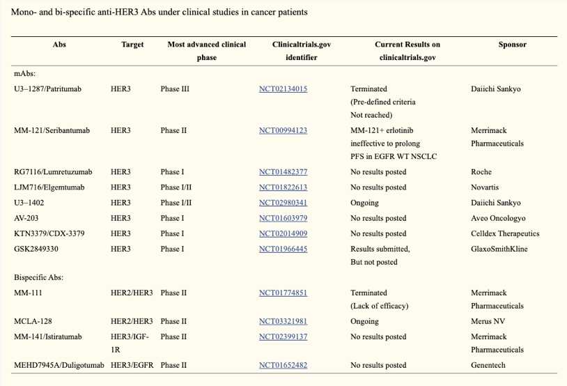 Currently, several therapeutic antibodies against HER3 are being investigated in clinical and preclinical studies. However, no antibodies have been approved by the FDA.
