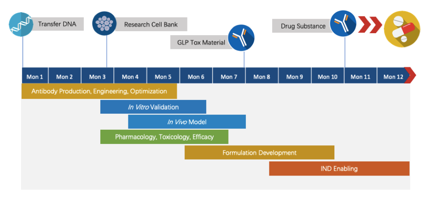 With extensive experience in the development of discovery and development of therapeutic antibodies, Creative Biolabs is committed to delivering the final complete program to our clients within 1.5 years before entering the IND stage. Here is a draft timeline for your glance.