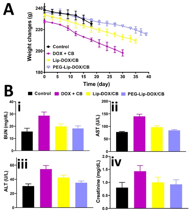 This study explored the therapeutic effects of liposomes encapsulating doxorubicin (DOX) and carboplatin (CB) on glioblastoma. Using reverse-phase evaporation, researchers created co-delivery of DOX and CD liposomes (PEGylated and non-PEGylated). These liposomes were utilized in the glioblastoma rat model, which was established by rat glioma C6 cells. The study assessed the rats' survival time, weight changes, serum levels of blood urea nitrogen (BUN), aspartate aminotransferase (AST), alanine aminotransferase (ALT), and creatinine. Results indicated that PEGylated liposomes led to lower increase in serum levels of BUN, AST, ALT, and creatinine than non-PEGylated liposomes. This could be attributed to PEG improving the stability of liposomes in the circulation, resulting in prolonged drug release. This study demonstrates that PEGylated liposomes have stronger therapeutic effects on glioblastoma than non-PEGylated liposomes. Moreover, PEGylated liposomes serve as an effective drug delivery platform for co-delivery.
