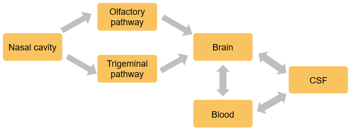 Fig. 1 Pathways of brain drug transport after intranasal administration.1,3