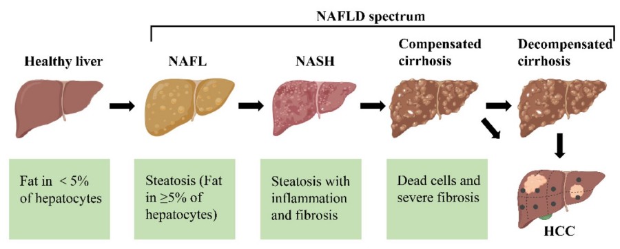 Nonalcoholic fatty liver disease (NAFLD), also called metabolic dysfunction-associated steatotic liver disease (MASLD), is a liver injury acquired due to metabolic stress. It's characterized by excessive lipid accumulation in hepatocytes, excluding damage from alcohol and other explicit hepatotoxins. NAFLD is closely associated with several metabolic disorders: