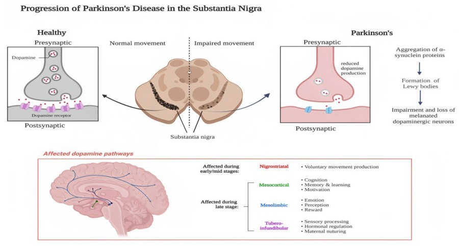 Parkinson's disease (PD) is the second most common neurodegenerative disorder after Alzheimer's disease. It is characterized by the degeneration of dopaminergic neurons in the substantia nigra, leading to dopamine deficiency and resulting in motor, cognitive, sensory, and emotional problems such as tremors, bradykinesia, balance impairment, rigidity, depression, hallucinations, and sleep disorders. PD arises from various mechanisms, including α-synuclein aggregation, neuroinflammation, and mitochondrial dysfunction.