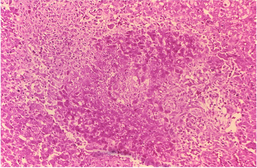 Fig.1 Granuloma and necrosis in the liver of a guinea pig infected with Brucella suis.