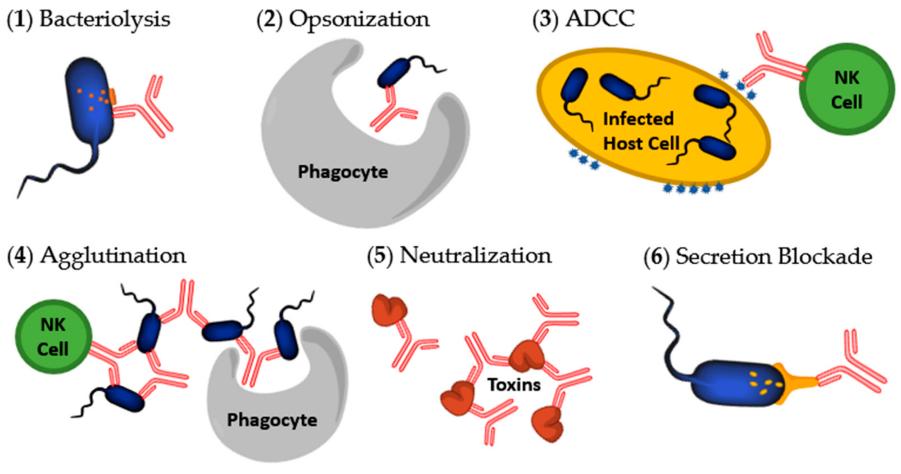 - Antibody-mediated complement-dependent killing activity - The Fc region of the antibody can bind to C1q, triggering the classical complement pathway to lyse bacteria.
