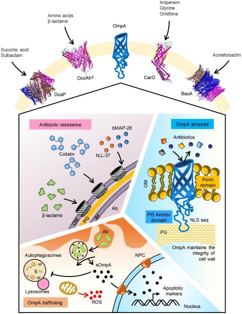 - Uppalapati, Siva R., Abhiroop Sett, and Ranjana Pathania. "The outer membrane proteins OmpA, CarO, and OprD of Acinetobacter baumannii confer a two-pronged defense in facilitating its success as a potent human pathogen." Frontiers in microbiology 11 (2020): 589234. Distributed under Open Access license CC By 4.0, without modification.